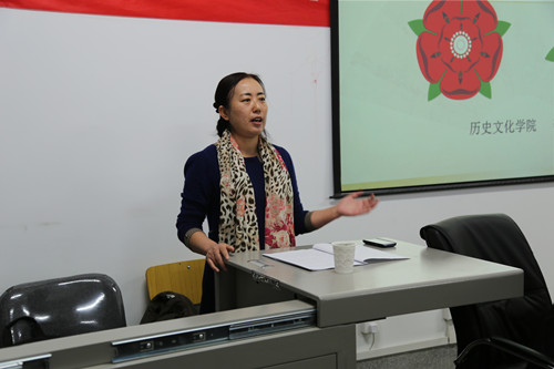 报告围绕着兰开斯特王朝亨利六世的王后,安茹的玛格丽特的一生展开。李老师通过对玛格丽特的人生描述把同学们带到了英法百年战争的末期,从英国跌宕起伏的历史中,看到了在社会转型时期的玫瑰战争中贵族的斗争,也通过王后的生活了解到许多英国的社会文化风貌。最后,李家莉老师对玫瑰战争爆发的原因进行了全面的分析,她认为战争体现了变态封建主义对英国社会的影响,是英国社会转型历程的组成部分。整场报告,李老师由浅入深,循循善诱,在生动讲述中不乏历史深刻性,不失为一场精彩的报告,同学们印象深刻。报告最后,李积顺老师做了精彩的点评,之后李家莉老师还就相关问题与学生进行了互动。