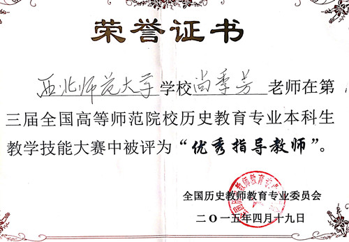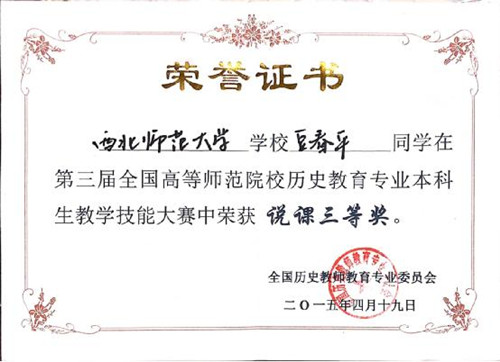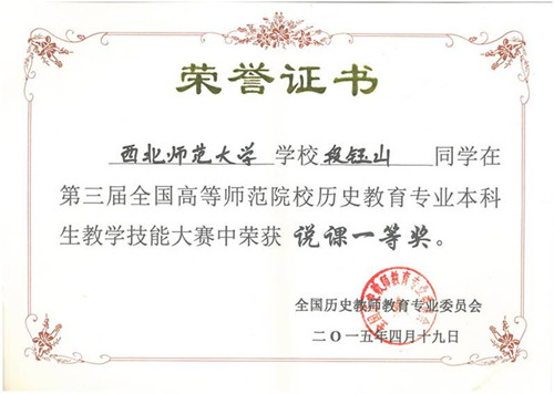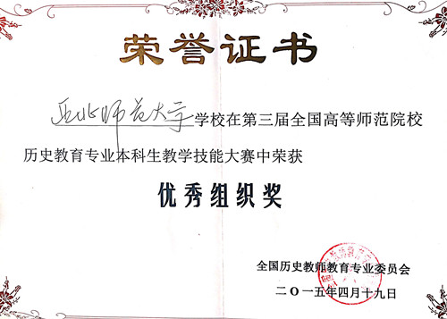 2015年4月17-19日,第三届全国高等师范院校历史教育专业本科生教学技能大赛在西南大学举行。来自华东师大、东北师大、首都师大、华中师大、陕西师大、西南大学和西北师大等56所高师院校的160名学子参加了此次比赛。天游线路官网获优秀组织奖,尚季芳教授获优秀指导教师,代表我校参赛的3名本科生全部获奖,其中孔祥辉获讲课一等奖,段钰山获说课一等奖,豆春萍获说课三等奖,为我校此次参赛交上了一份满意的答卷。
