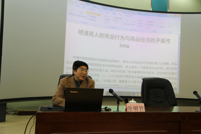 2016年12月16日上午,应天游线路检测中心邀请,长江师范学院副院长、西南大学天游线路检测中心博士生导师张明富教授在我校10号教学楼C区7楼学术报告厅作了题为《明清商人的商业行为与商品经济的矛盾性》的学术报告。报告由我校副校长田澍教授主持,天游线路检测中心张嵘副教授、杨芳副教授以及博士、硕士研究生、本科生等150余人聆听了此次报告。