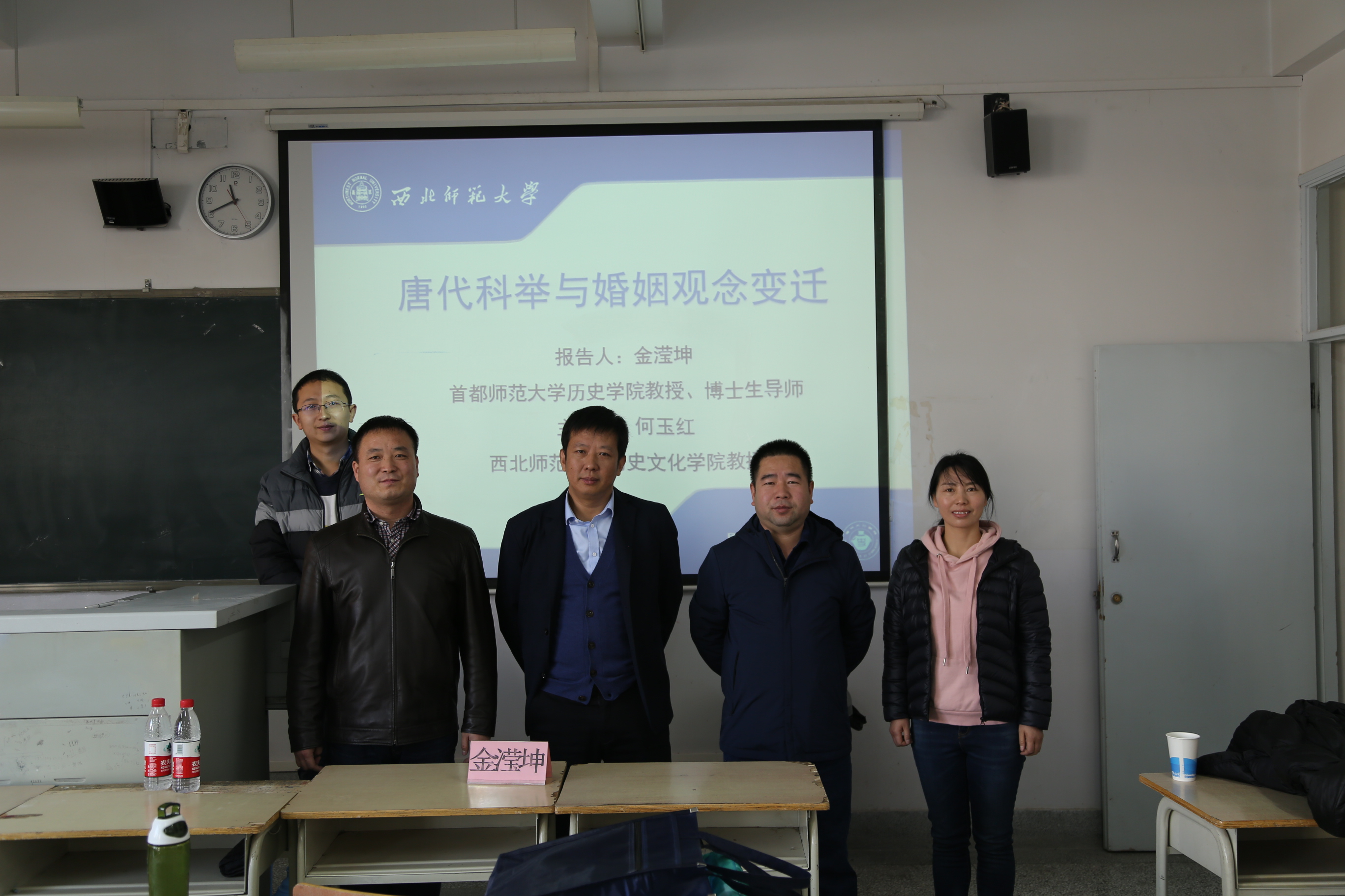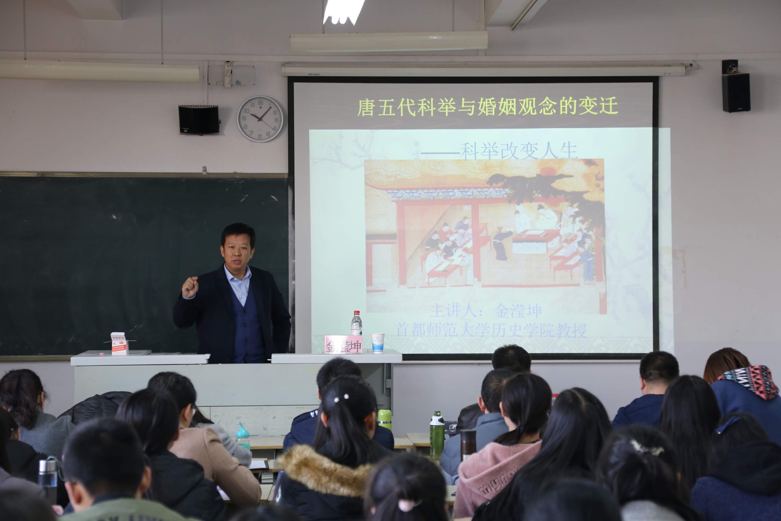 报告从科举对婚姻观念变迁的影响这一话题谈起,特别就科举影响下的唐代的脔婿文化以及科举影响婚姻观念变迁的原因展开深入解读。金教授的报告视野开阔,打通断代的界限,从魏晋南北朝到明清长时段的变迁来考察唐代科举制度的特点和作用,报告还注重从制度与观念互动的角度对唐代科举制度进行分析,新颖别致。报告会上,金滢坤教授还就首都师范大学历史学研究生招生与培养等向与会同学做了讲解,并与现场师生进行了互动交流。