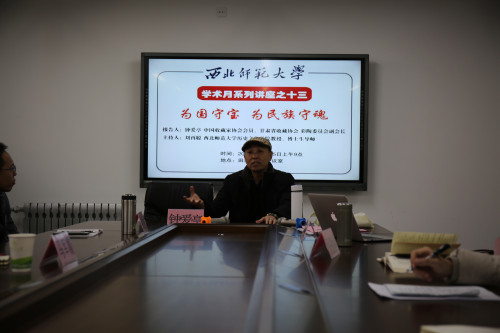 2018年12月25日,中国收藏家协会会员、甘肃省收藏家协会彩陶委员会副会长钟爱亭老师在7号楼314会议室做了题为《为国守宝 为民族守魂》的学术报告。报告会由刘再聪教授主持,马军霞、张之佐、鲁宸伊等老师及研究生、本科生60多人参加了报告会。