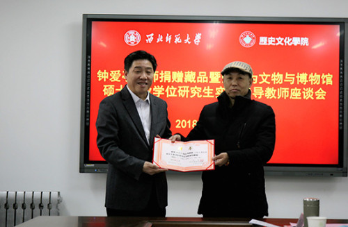 张俊宗指出,文物是国家历史生生不息的见证,“为国家守宝,为民族守魂”,保护国宝是每个人的责任。钟爱亭先生作为甘肃知名收藏家,将自己的藏品无偿捐献给西北师大,支持学校文物与博物馆专业的教学发展,不仅为人才培养创造了更好条件,也补充了学校博物馆藏品数量,必将推进文物与博物馆专业等学科的进一步发展。