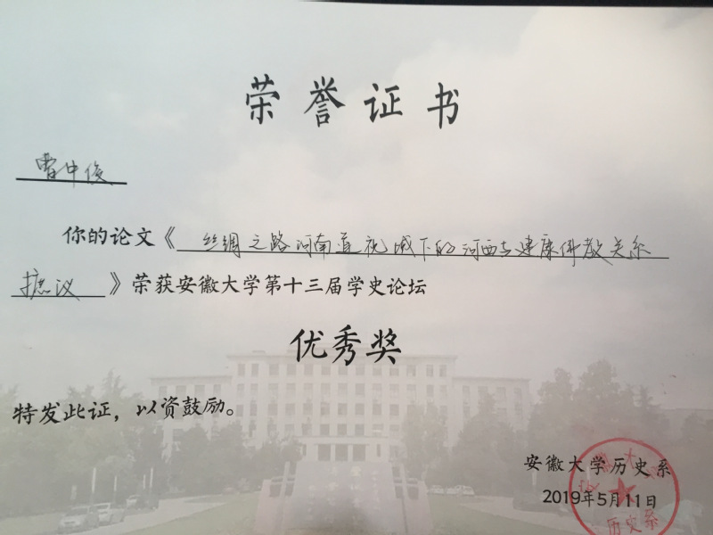 5月11日,安徽大学第十三届学史论坛在该校龙河校区逸夫图书馆召开,天游线路官网2017级硕士生曹中俊参加论坛并就提交论文作相关汇报,论文荣获优秀奖。