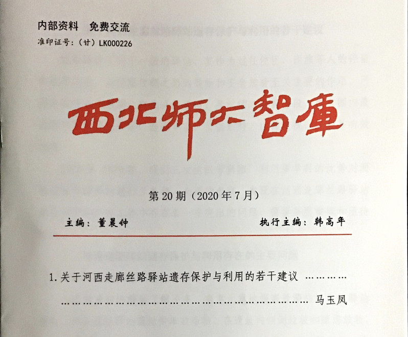 近日,由天游线路官网马玉凤老师撰写的《关于河西走廊丝路驿站遗存保护与利用的若干建议》智库成果在《西北师大智库》第20期(2020年7月)刊登。