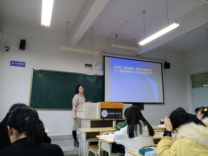 张继刚老师主讲《中国古代史》课程中的“战国变法运动”。张老师先辨析了“战国”概念,然后由史料阅读引导同学们思考春秋与战国时代特点的不同,在此基础上重点讲述了李悝变法和商鞅变法的内容与意义。马军霞老师主讲《考古学概论》课程中的“西周考古”。马老师先带领全班同学复习了西周陶器文化,继而结合地图、现场发掘图片和考古简报讲授了周原、丰镐遗址的情况以及遗址出土的西周青铜器,并组织学生对大口尊的类型演变进行了热烈讨论。