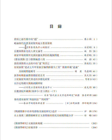 《简牍学研究》第十辑共刊发论文14篇,内容涉及曾侯乙墓竹简、里耶秦简、岳麓秦简、胡家草场汉简、敦煌汉简、悬泉汉简、居延汉简、武威汉简、走马楼吴简研究的最新成果。本辑海外学者代表性简牍研究成果译介栏目中重点推介了日本学界的著作。西北大学单印飞翻译的已故日本东洋大学石岗浩教授的《秦的连坐制与“与盗同法”“与同罪”》一文探讨了秦代的特殊连坐罪。日本“秦代出土文字史料研究班”撰写的《岳麓书院所藏〈秦律令(一)〉译注一(下)》代表了日本学界系统研究岳麓秦简的阶段性成果,对推进岳麓秦简和秦代法制史研究有较大学术价值。