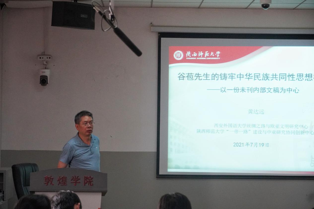 2021年7月19日下午,西安外国语大学丝绸之路与欧亚文明研究中心主任、博士生导师黄达远教授在天游8线路注册检测中心敦煌学院会议室,为我校丝绸之路文明基地班同学作了题为《谷苞先生的中华民族共通性思想初探》的专题讲座。