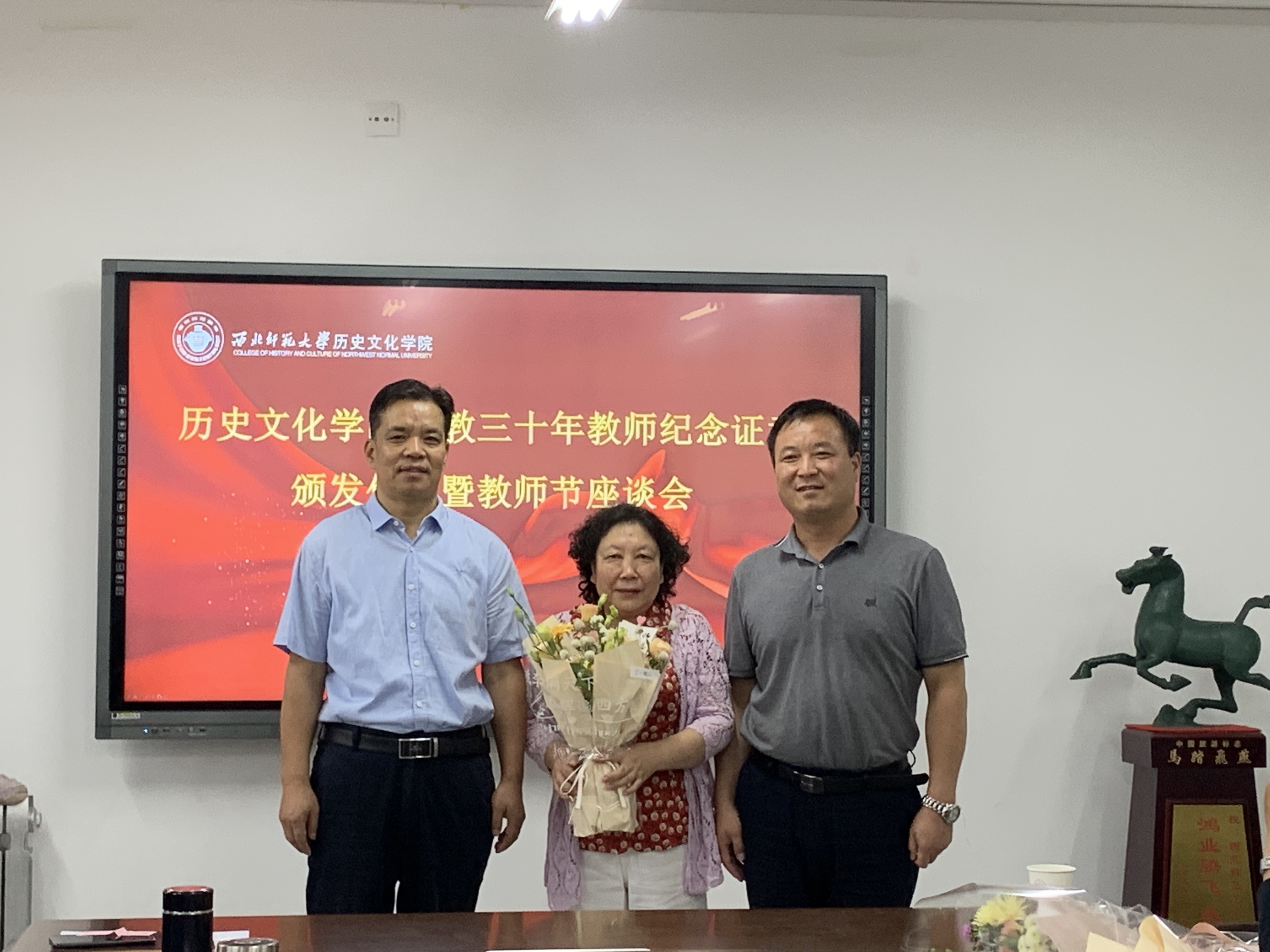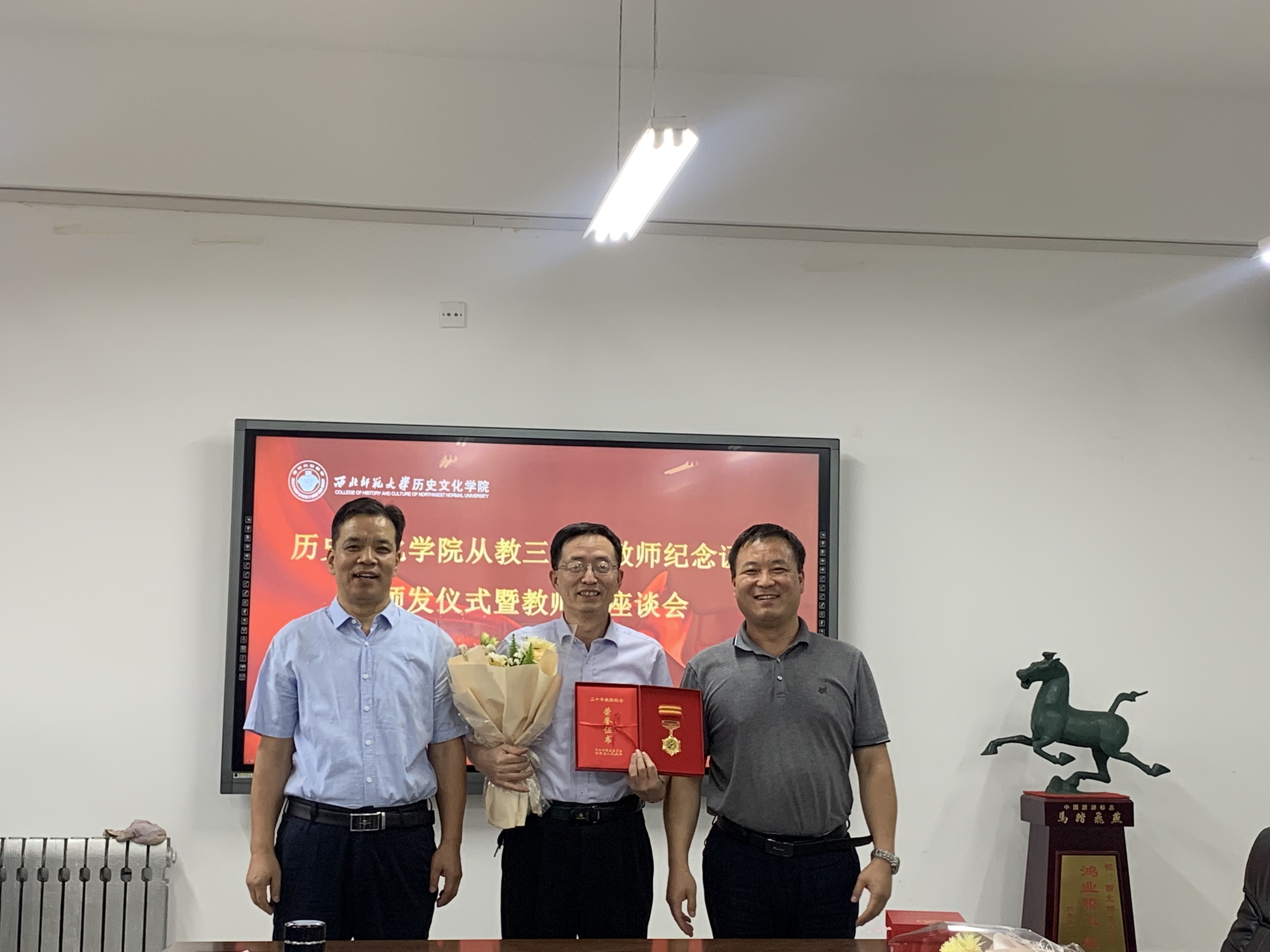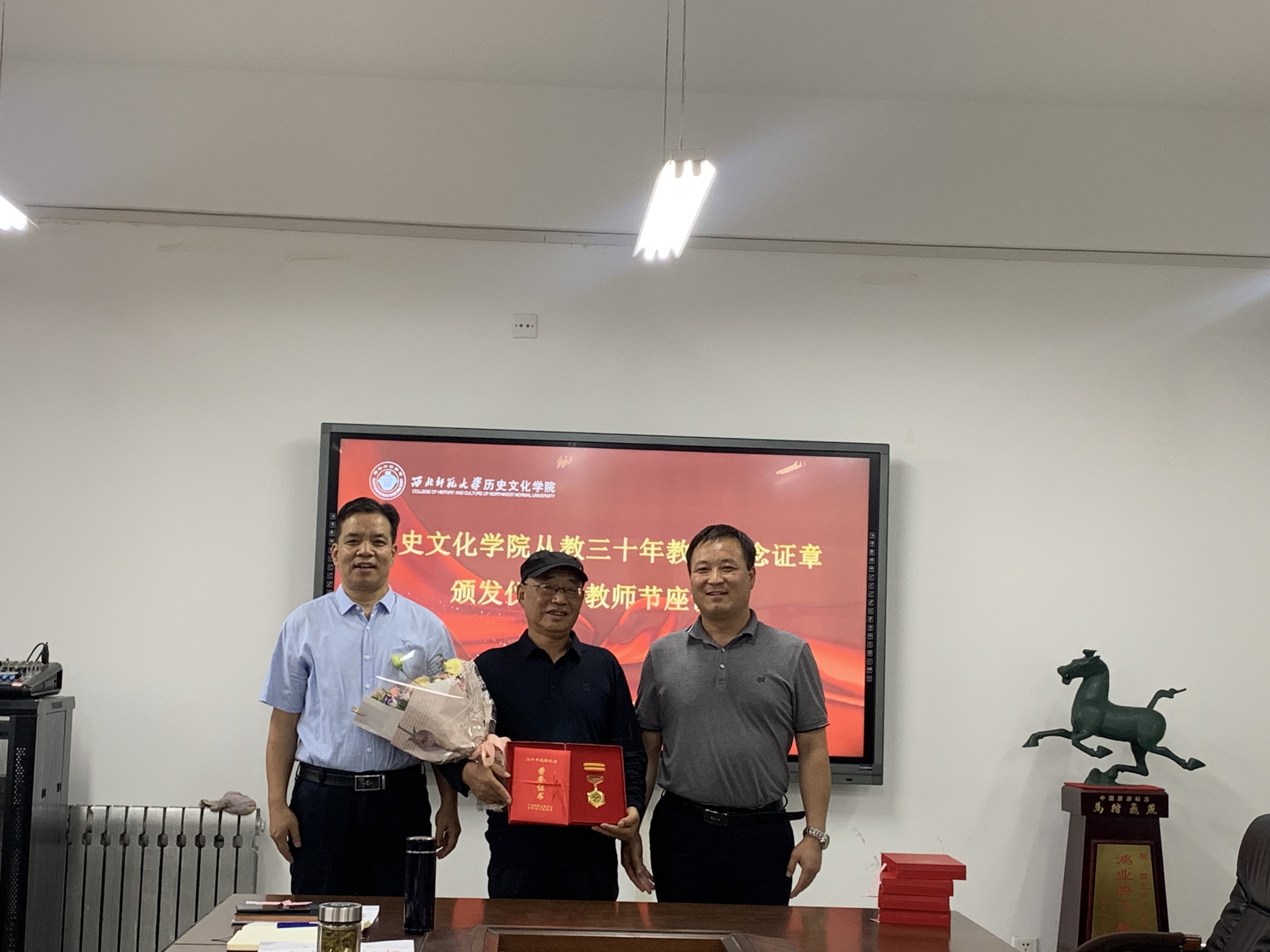 学院党委书记康智杰、院长何玉红为天游线路官网从教逾30年的七位教师:李并成研究员、杨鹏飞教授、黄兆宏副教授、党庆兰教授、刘再聪教授、张玉霞副教授、张嵘副教授颁发了荣誉证书和奖章,并为光荣退休的陈秀实老师送上鲜花。