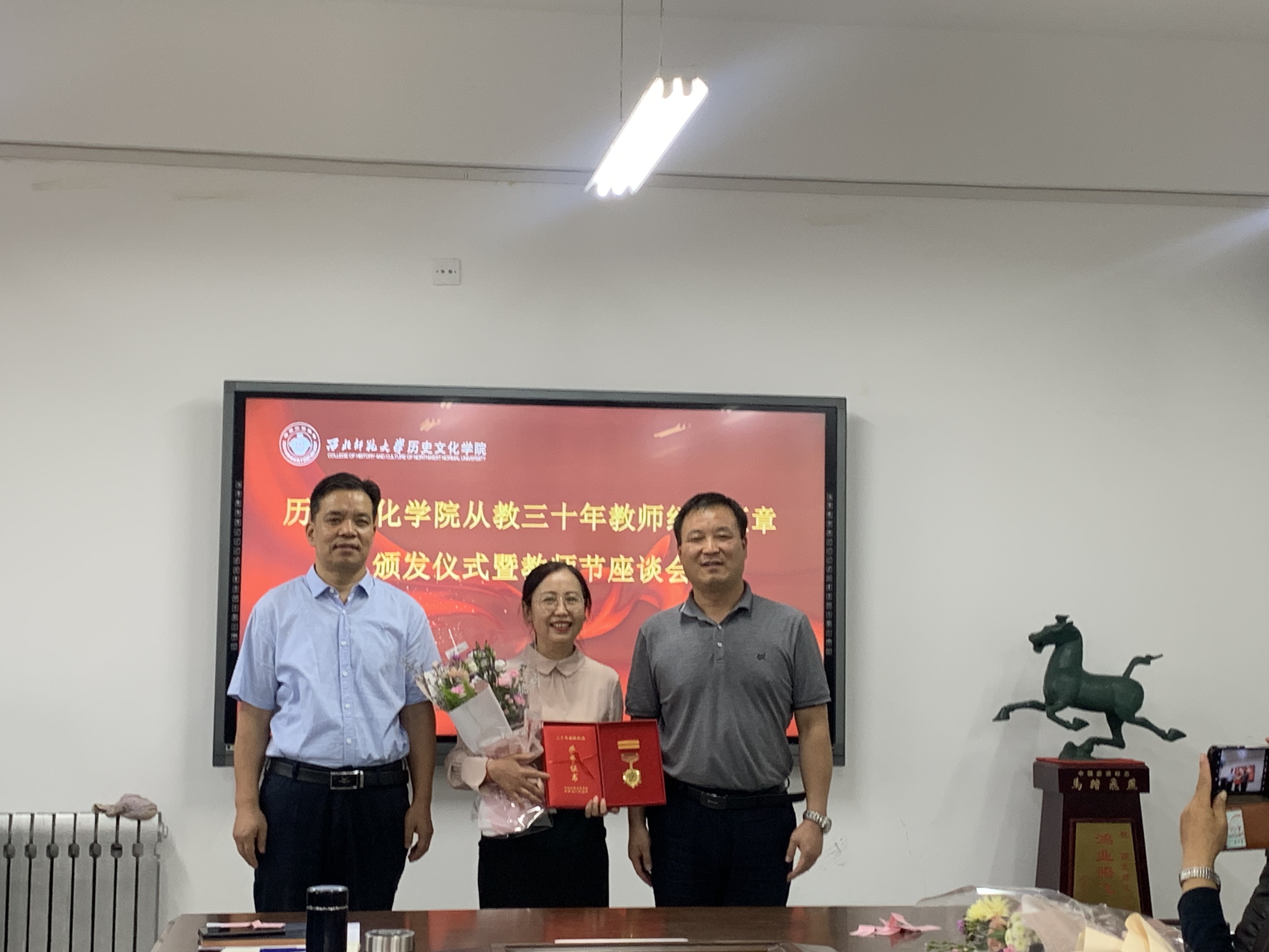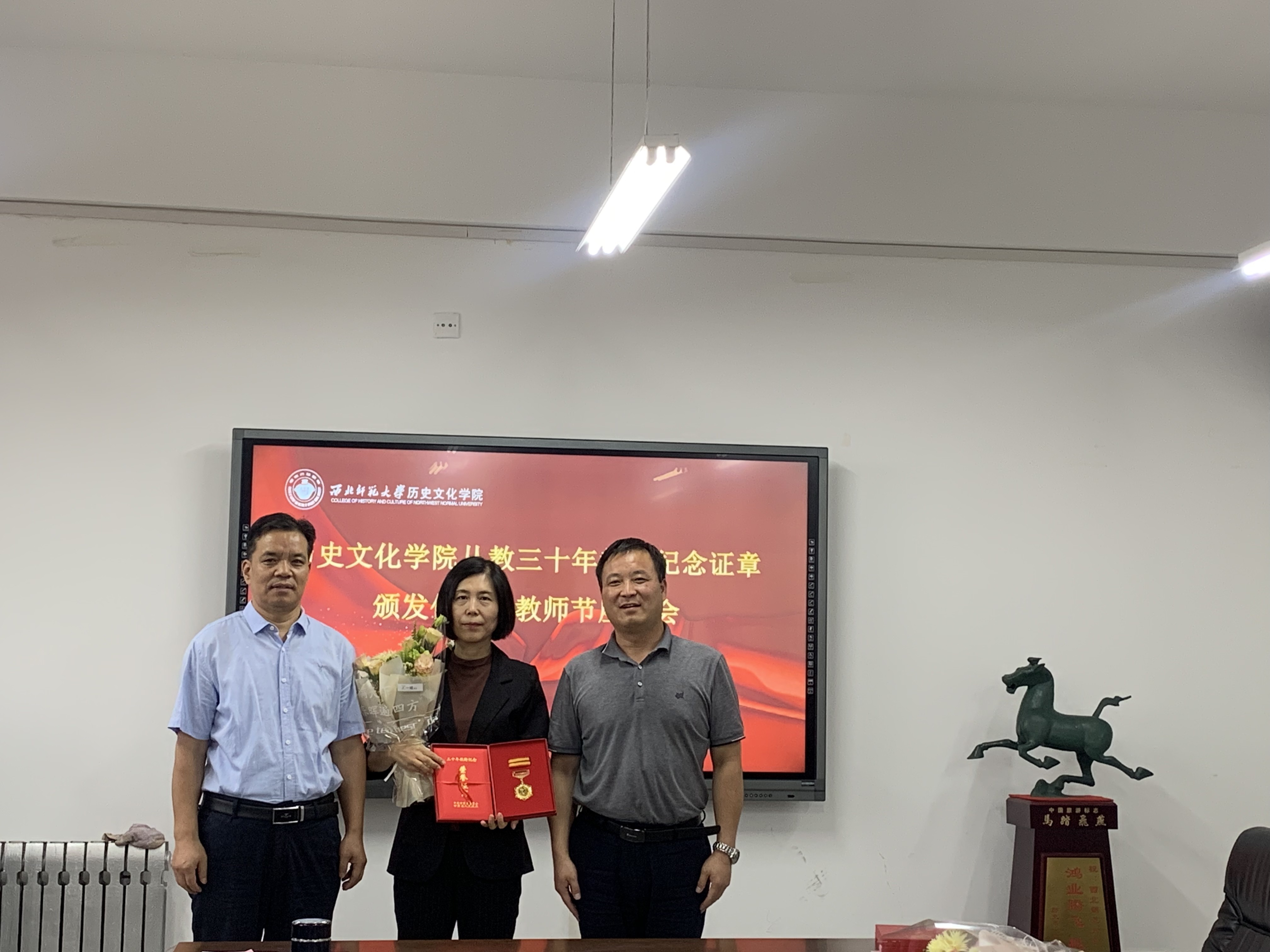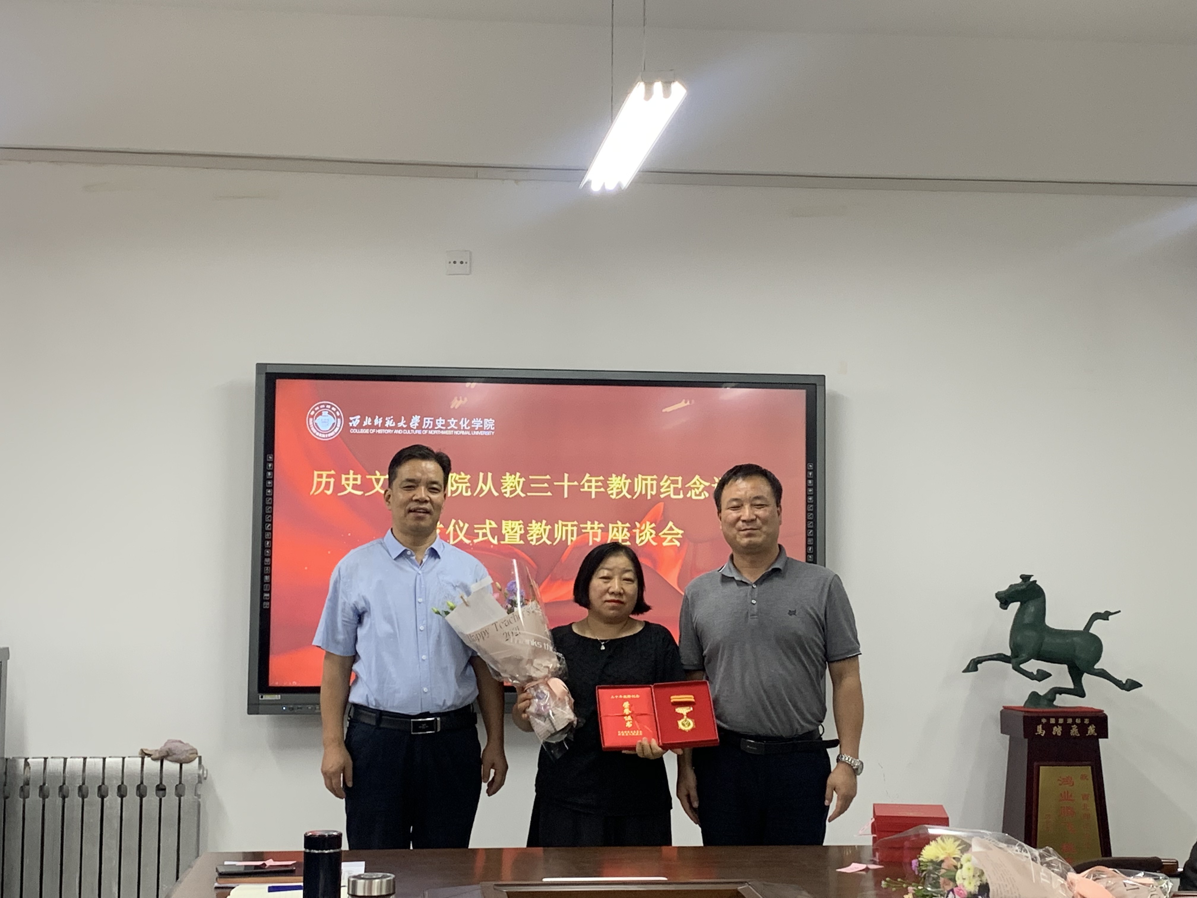 学院党委书记康智杰、院长何玉红为天游线路官网从教逾30年的七位教师:李并成研究员、杨鹏飞教授、黄兆宏副教授、党庆兰教授、刘再聪教授、张玉霞副教授、张嵘副教授颁发了荣誉证书和奖章,并为光荣退休的陈秀实老师送上鲜花。