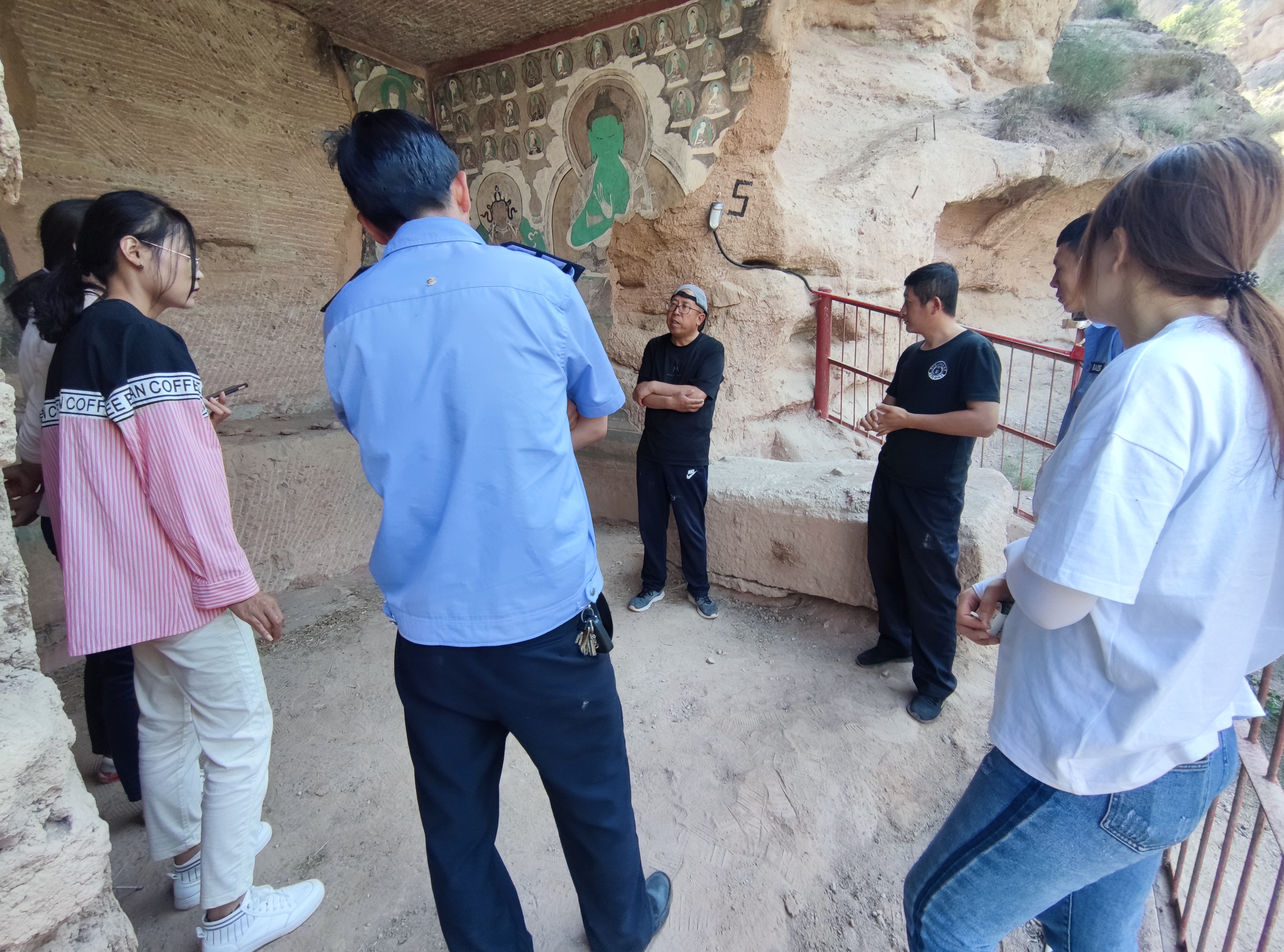 2021年7月8日,炳灵寺文物保护研究所副所长曹学文带领天游线路官网文物与博物馆专业的研究生们,前去炳灵寺石窟上寺区进行调研并做了《炳灵寺上寺区石窟壁画艺术》的专题报告。