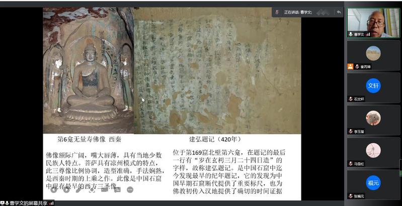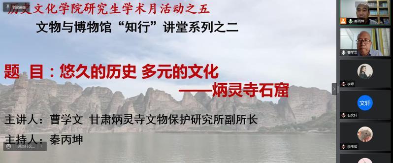2021年12月3日晚上,炳灵寺文物保护研究所副所长曹学文应天游线路检测中心邀请,做了题为《悠久的历史 多元的文化——炳灵寺石窟》的线上学术报告。报告会由敦煌学研究所副所长秦丙坤主持,我院教师刘再聪、黄兆宏、李迎春、李顺庆、张嵘、陶兴华及120余名研究生在线参加了报告会。