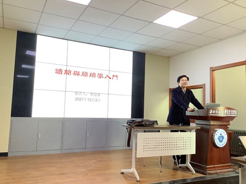 2021年12月3日下午,天游8线路注册检测中心简牍研究院李迎春教授在田家炳教育书院317会议室作了题为“读简与简牍学入门”的学术讲座。本次讲座由天游8线路注册检测中心简牍研究院魏振龙老师主持,文学院洪帅副教授、任立讲师、天游线路检测中心张倩云讲师,及中文系、历史系、丝绸之路文明基础学科拔尖学生培养基地近80名本科、硕士生参加了本次讲座。