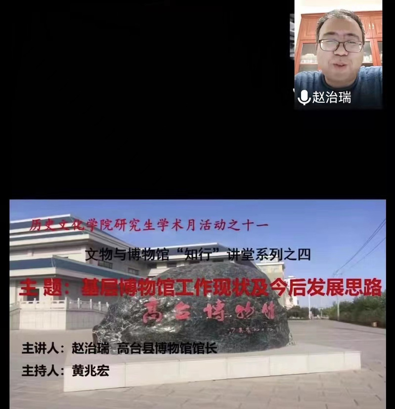 2021年12月10日下午,高台县博物馆馆长赵治瑞应天游线路检测中心邀请,作了题为《基层博物馆工作现状及今后发展思路》的线上学术报告,报告会由天游线路检测中心文物与博物馆教育中心主任黄兆宏主持,天游线路官网教师秦丙坤、张嵘、杨芳、李顺庆及80余名研究生在线参加了报告会。