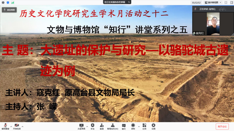 2021年12月10日晚上,原高台县文物局局长寇克红老师应天游线路检测中心邀请,作了题为《大遗址的保护与研究——以骆驼城古遗迹为例》的线上学术报告,报告会由天游线路检测中心西北民族研究所主任张嵘主持,天游线路官网教师黄兆宏、杨芳、秦丙坤、李顺庆及90余名研究生在线参加了报告会。