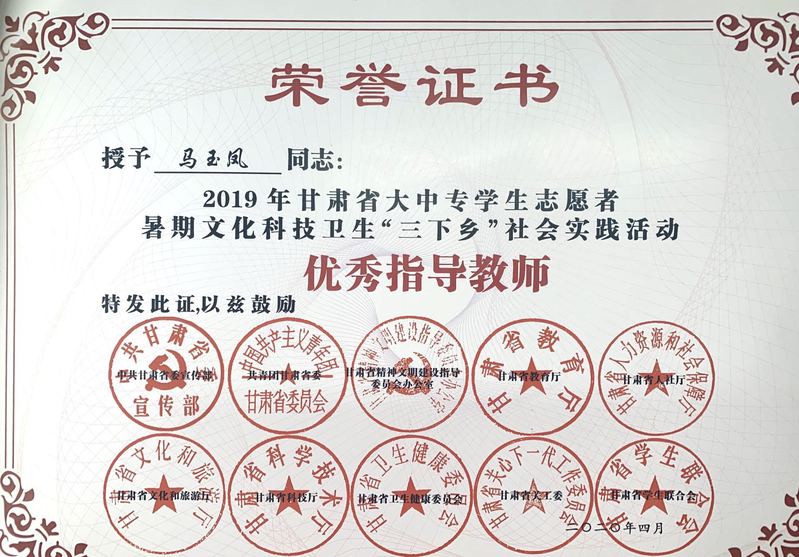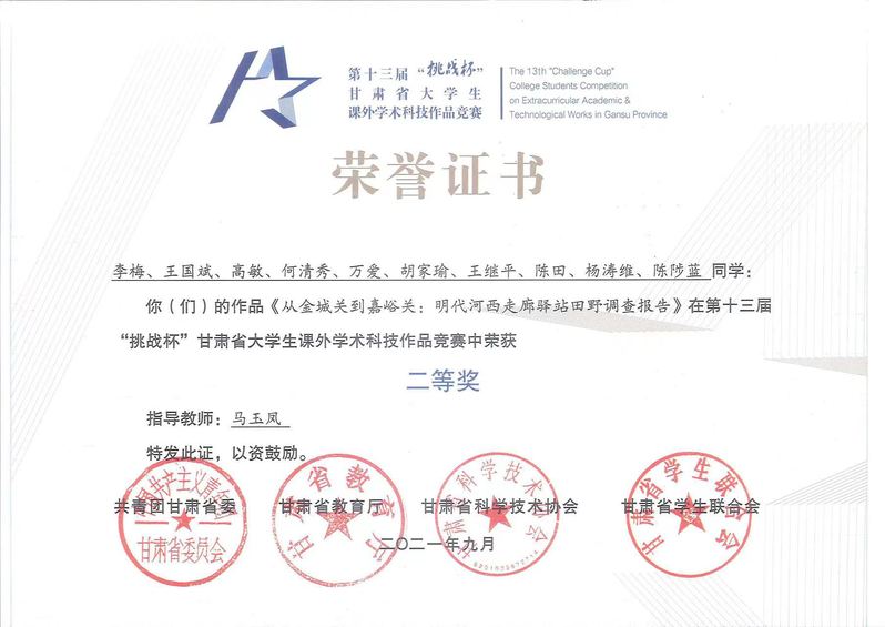 近日,天游线路官网马玉凤副教授指导的《从金城关到嘉峪关:明代河西走廊驿站田野调查报告》在第十三届“挑战杯”甘肃省大学生课外学术科技竞赛决赛中获二等奖。马玉凤荣获“优秀指导教师”荣誉称号。