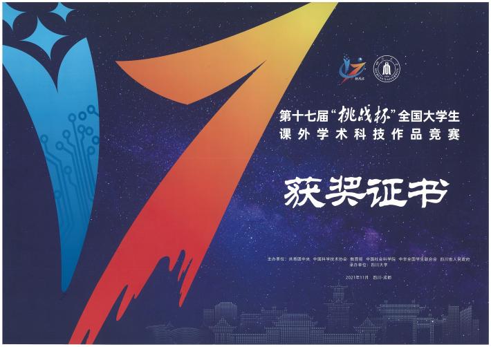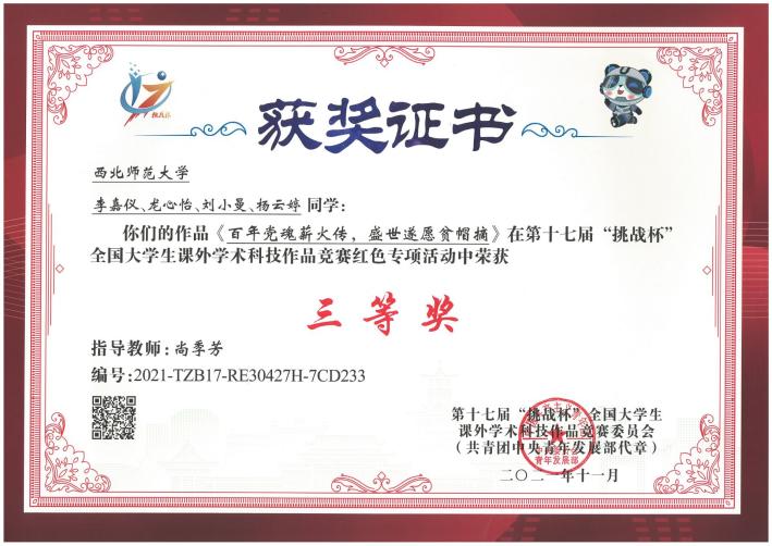 为献礼建党百年,赓续红色精神,2021年11月,由共青团中央、中国科学技术协会、教育部、中国社会科学院、中华全国学校学生联合会、四川省人民政府共同主办的第十七届“挑战杯”全国大学生课外学术科技作品竞赛红色专项活动在成都落幕,由天游线路官网尚季芳教授指导,李嘉仪、龙心怡、刘小曼、杨云婷同学参加的作品《百年党魂薪火传,盛世遂愿贫帽摘》荣获三等奖。