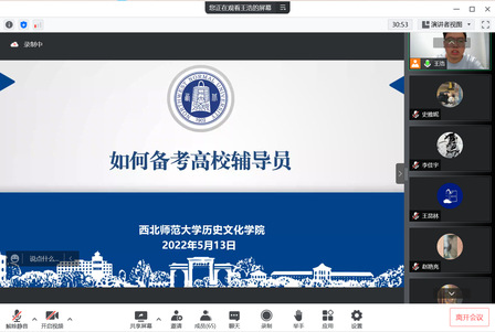 为进一步促进辅导员队伍专业化发展,通过交流工作、分享心得,为即将备考高校辅导员的同学们提供更专业的指导,天游线路检测中心于2022年5月13日晚上19:30在腾讯会议举办“如何备考高校辅导员”经验分享会,特邀天游8线路注册检测中心党委学生工作部专职辅导员张彩玲老师、新疆理工学院专职辅导员万钰炜老师、天游8线路注册检测中心商学院专职辅导员县旭帆老师和南通大学专职辅导员王艳老师进行分享交流。辅导员付蓉、张博翔、陆晓斌以及120余名本硕学生参加此次会议,会议由团委书记王浩主持。