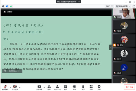 最后,王艳老师向备考学生提出要熟悉政策要点、关注时事热点等建议,并通过启动心理危机预案的案例分析,向同学们剖析了辅导员在日常工作中的职责和作用。