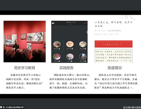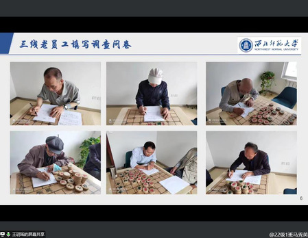 “甘肃地区三线企业内迁职工婚姻问题研究——以白银公司为中心”的考察团队通过填写调查问卷和口述调研等形式对白银公司三线厂遗址和老一辈三线建设者住址进行线上调研,通过此次调研,大家对三线建设有了更深入的了解,并且增强了对共和国史的认识,感悟到老一辈爱国知识分子的奋斗之路。团队代表顾思宇说“我们作为当代中国青年,更应该传承和践行‘三线精神’发扬艰苦卓绝、爱国奉献的光荣传统,到西北去,到祖国需要的地方去,担起中华民族伟大复兴的重任。”