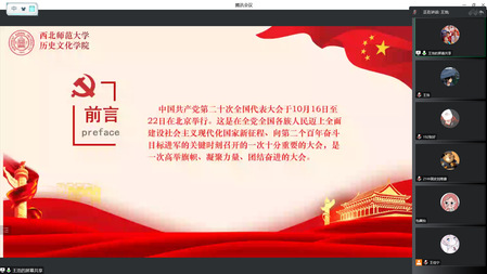 宣讲会开始,王浩老师播放了视频短片《领航》、网络纪录片集锦以及党的二十大预告片,并带领参会学生深入学习领会党的二十大的主题,就学生疫情防控下不遵守纪律的情况举例,强调了“继续加强纪律建设,把制度的笼子扎得更加严密”的重要性,就现实生活,生动的向学生阐述了以伟大自我革命引领伟大社会革命的必要性和重要性。
