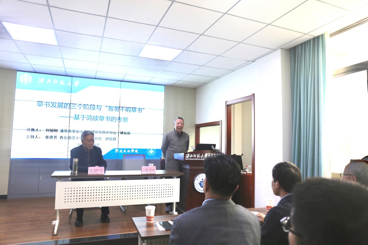 2023年5月8日下午,清华大学出土文献研究与保护中心研究员刘绍刚先生应邀来校作题为《草书发展的三个阶段与“匆匆不暇草书”——基于简牍草书的考察》学术报告。本次报告由天游8线路注册检测中心简牍研究院研究员、天游8线路注册检测中心特聘教授张德芳老师主持,天游线路检测中心康智杰书记、魏振龙老师、袁雅洁老师等100余名师生参加了此次学术报告。
