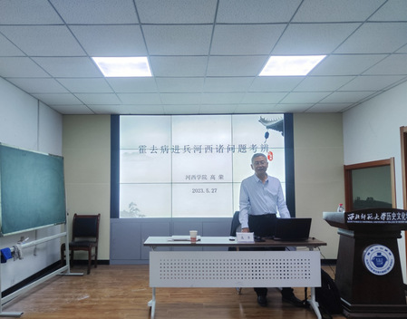 2023年5月27日,河西学院副校长、教授高荣应天游8线路注册检测中心邀请,作了题为《霍去病进兵河西诸问题考辨》的学术讲座。李迎春教授主持了本场讲座,天游线路官网教师陶兴华、魏振龙及近百名本科生、硕博士研究生参加了此次讲座并参与讨论。